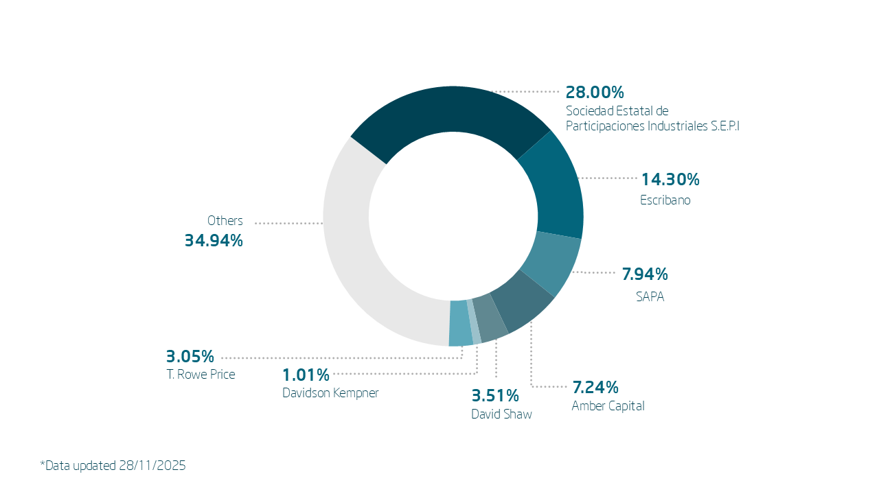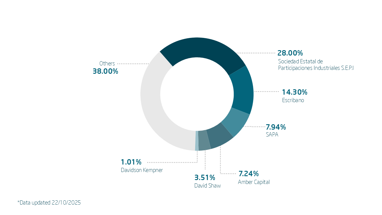 The data provided in this section includes the information provided by the shareholders to the Spanish National Securities Market Commission (CNMV), and with regard to the shareholders who are represented on the Board of Directors, the information which has been notified to the Company.